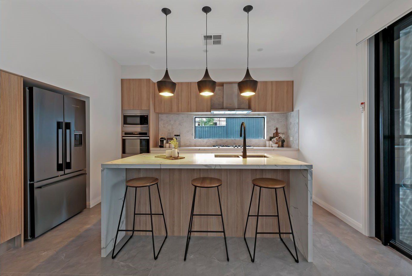 - High end Calcutta stone kitchen benchtops, hexagon carrara splash back, warmly enriched with neutral tone cabinetry